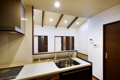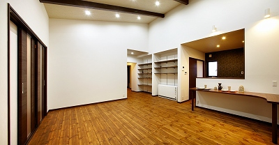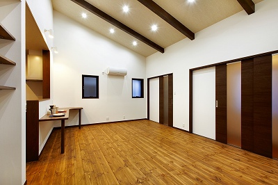 玄関土間の引違い戸を引くとすぐリビングダイニングとなっています。洗面室、トイレ、寝室以外には一切扉はなく、ワンフロアとなっています。