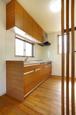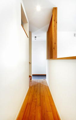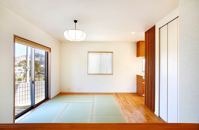 畳での生活が好きだというご主人の、リビングが和室の家です。壁付きのキッチン、通路となる部分はフローリング仕上げとなっています。