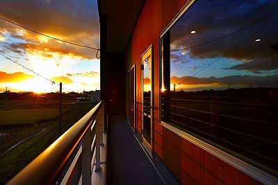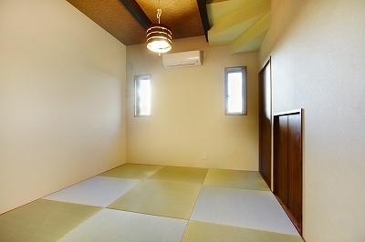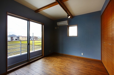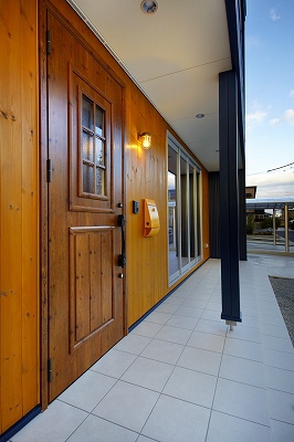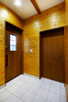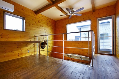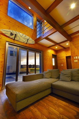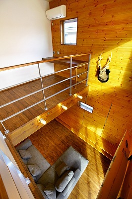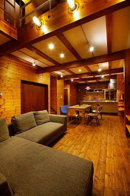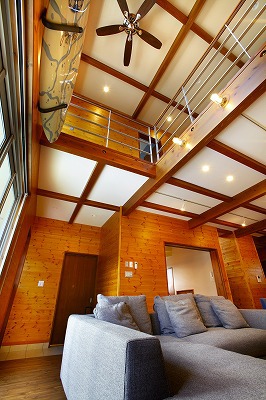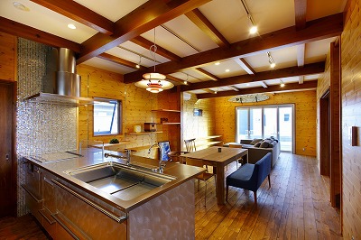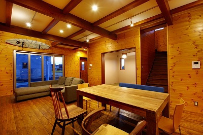 壁や床をパイン材で仕上げました。同じパイン材でも塗料を変えてメリハリをつけた室内。リビング、ダイニング、キッチンと配置し、リビング部分は吹き抜けとなっており2階の窓からも十分な光が注ぐ明るい空間です。