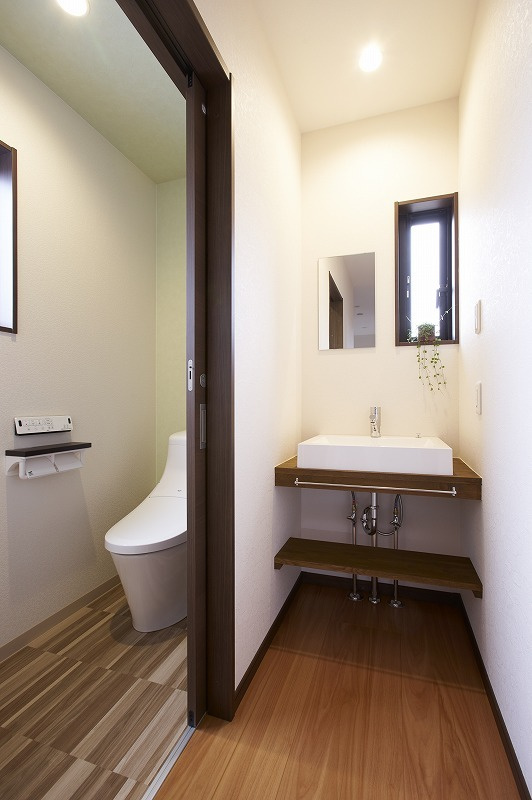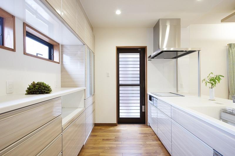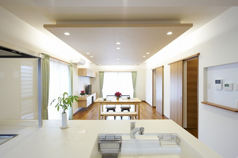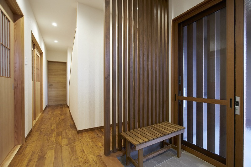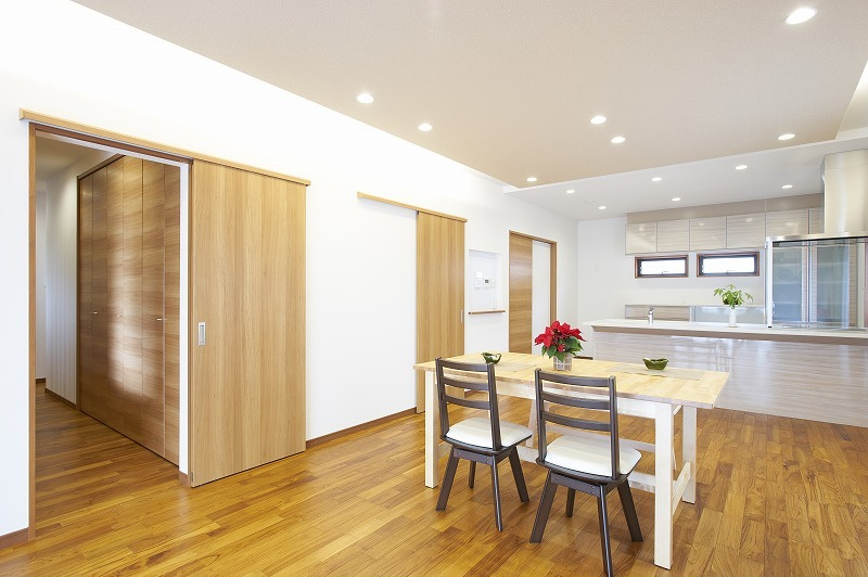 納戸代わりの広々屋根裏収納や、無垢材を使ったフロアー、建具を再利用した落ち着きのある和モダンスタイルのお家です。