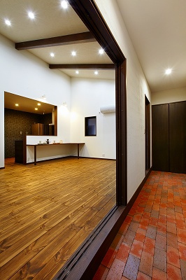玄関土間の引違い戸を引くとすぐリビングダイニングとなっています。洗面室、トイレ、寝室以外には一切扉はなく、ワンフロアとなっています。