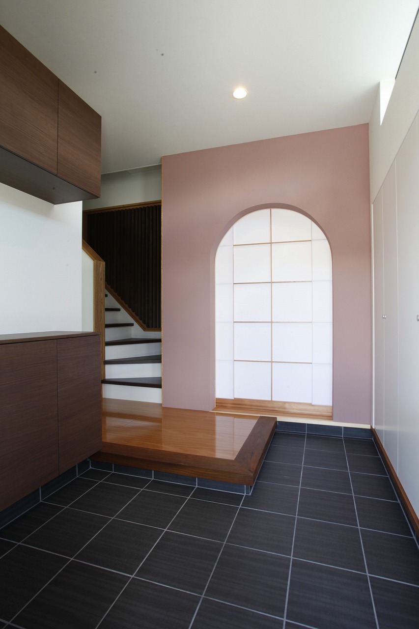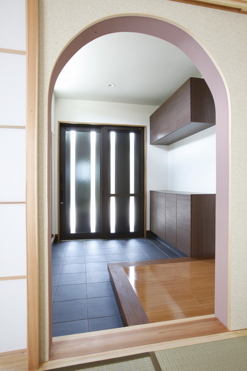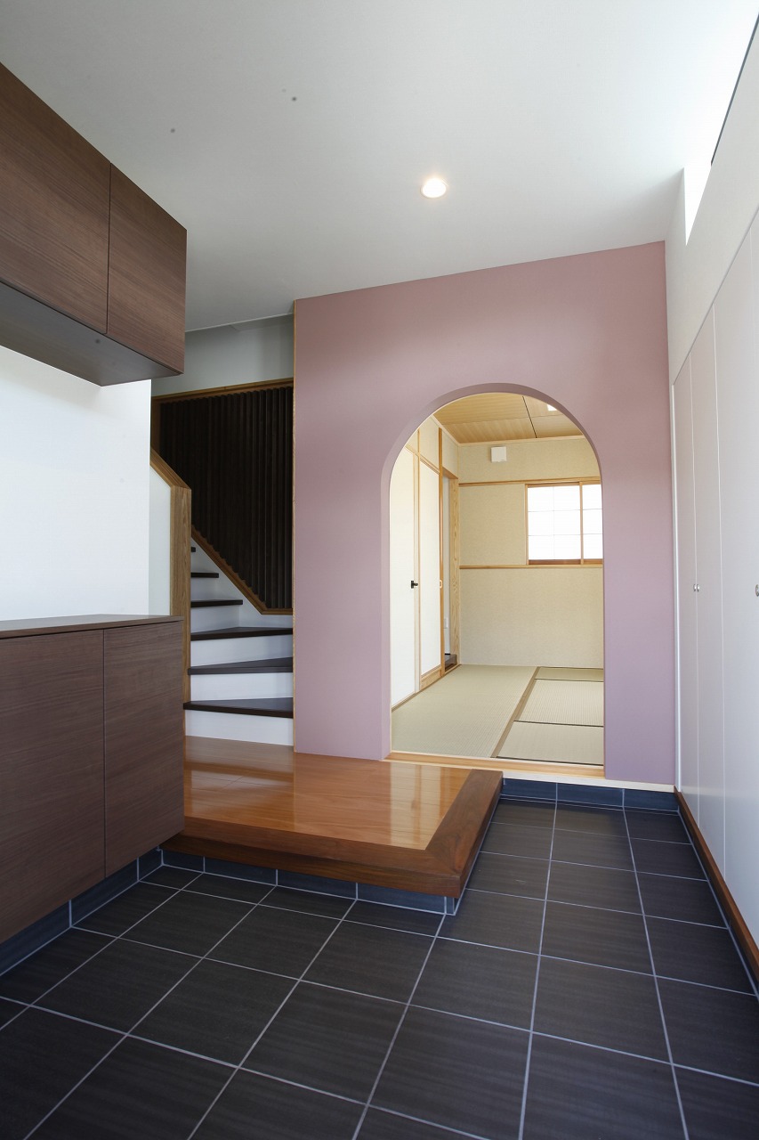 懐かしい「通り土間」を現代風にアレンジしたキッチンから和室へつながる小道は敷石や玉砂利を入れ、玄関前の和室にくぐる門の形は円形にしてピンク系の塗り壁に。