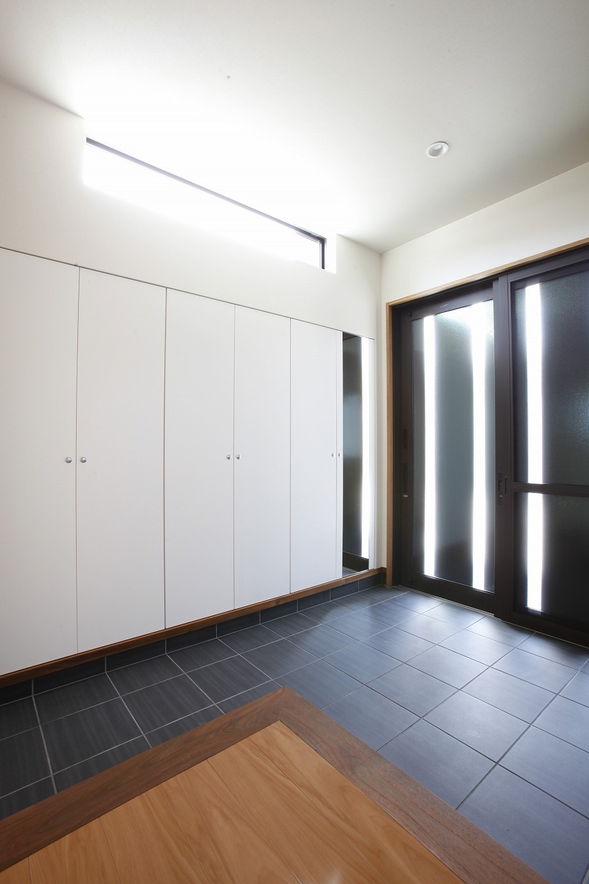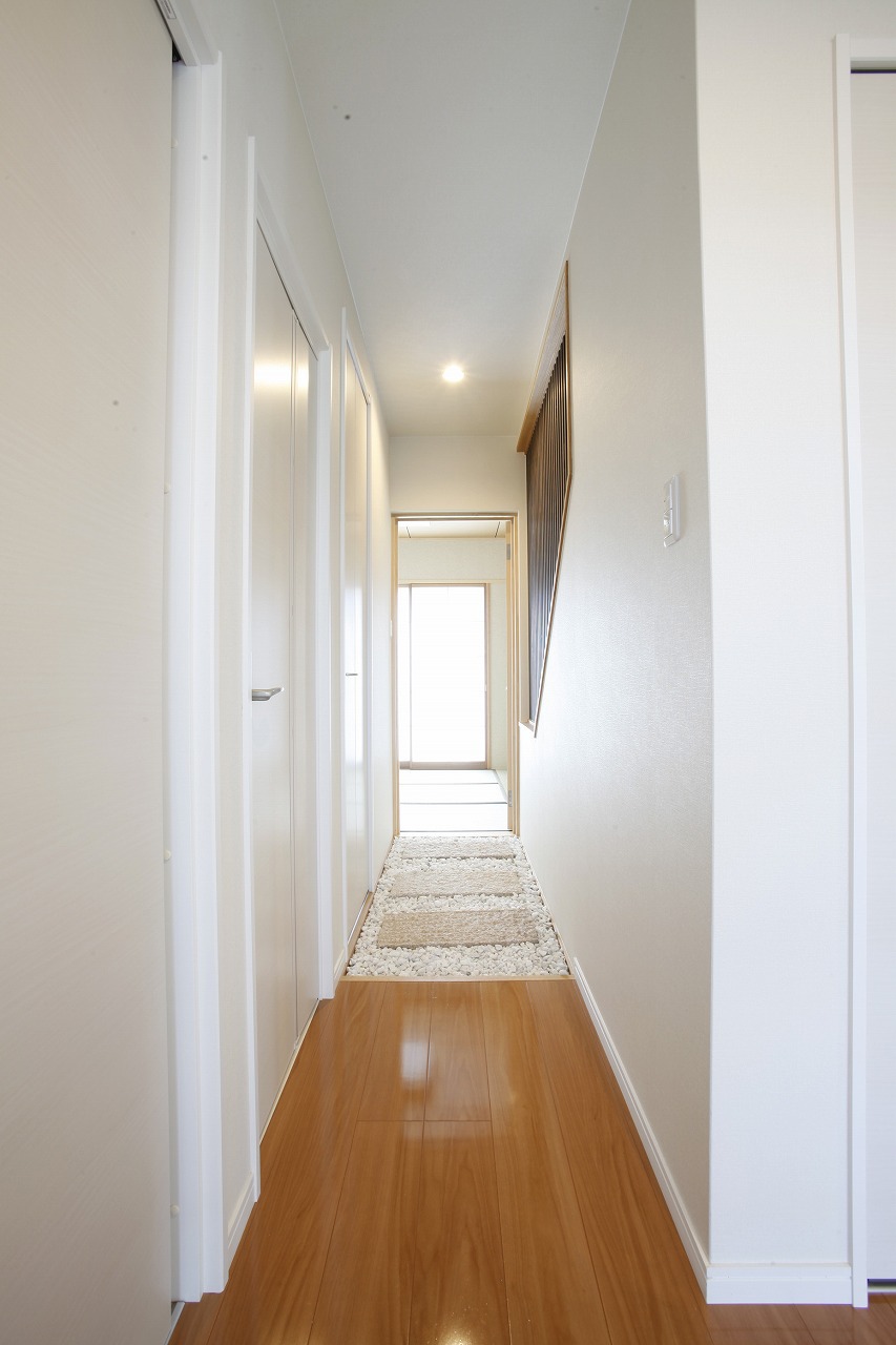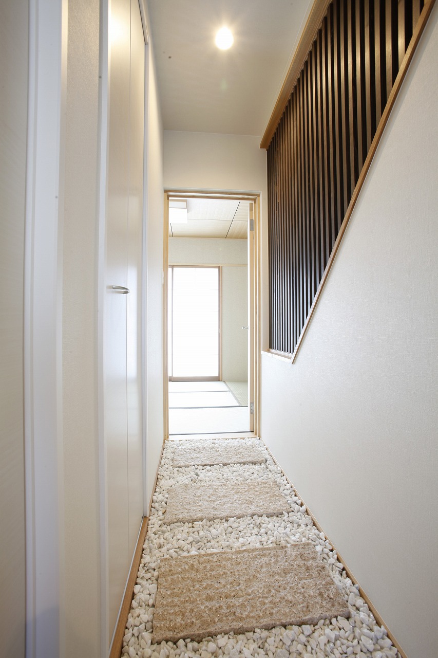 懐かしい「通り土間」を現代風にアレンジしたキッチンから和室へつながる小道は敷石や玉砂利を入れ、玄関前の和室にくぐる門の形は円形にしてピンク系の塗り壁に。