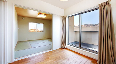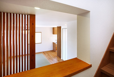 畳での生活が好きだというご主人の、リビングが和室の家です。壁付きのキッチン、通路となる部分はフローリング仕上げとなっています。