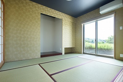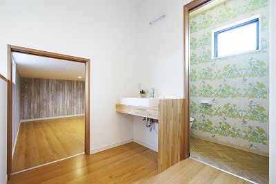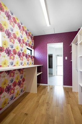 奥様のことを考えた家事同線で大容量の収納を備えた家事室は大胆な柄、色づかいで入るだけで元気でハッピーな気分になれそうです。