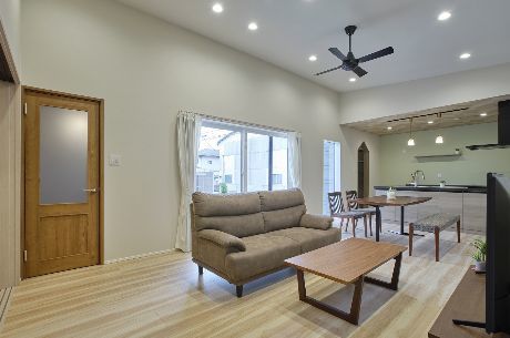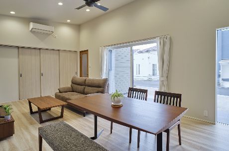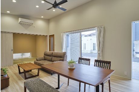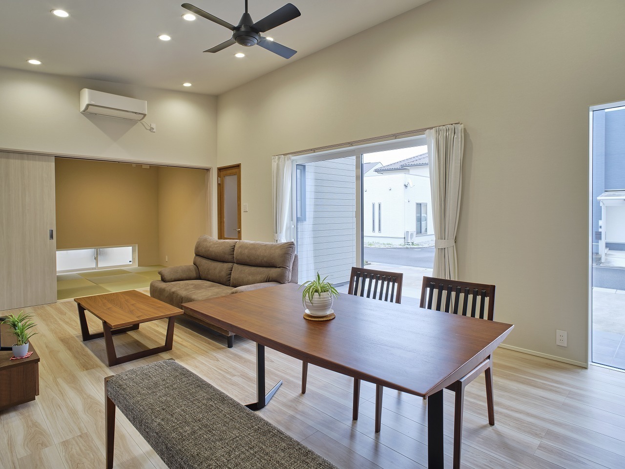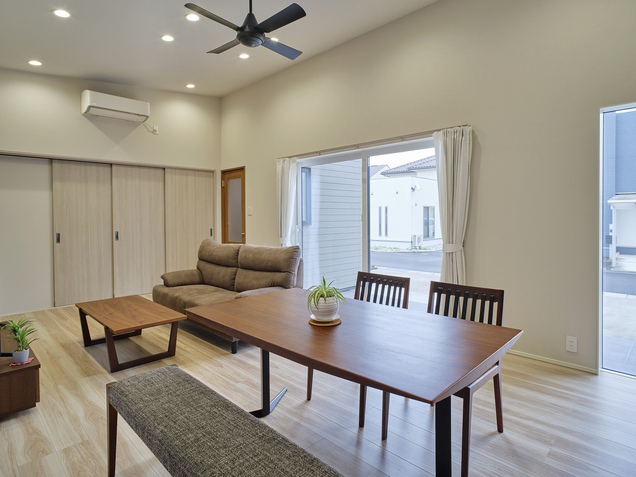 大開口窓と高天井のリビングは開放感たっぷりです。