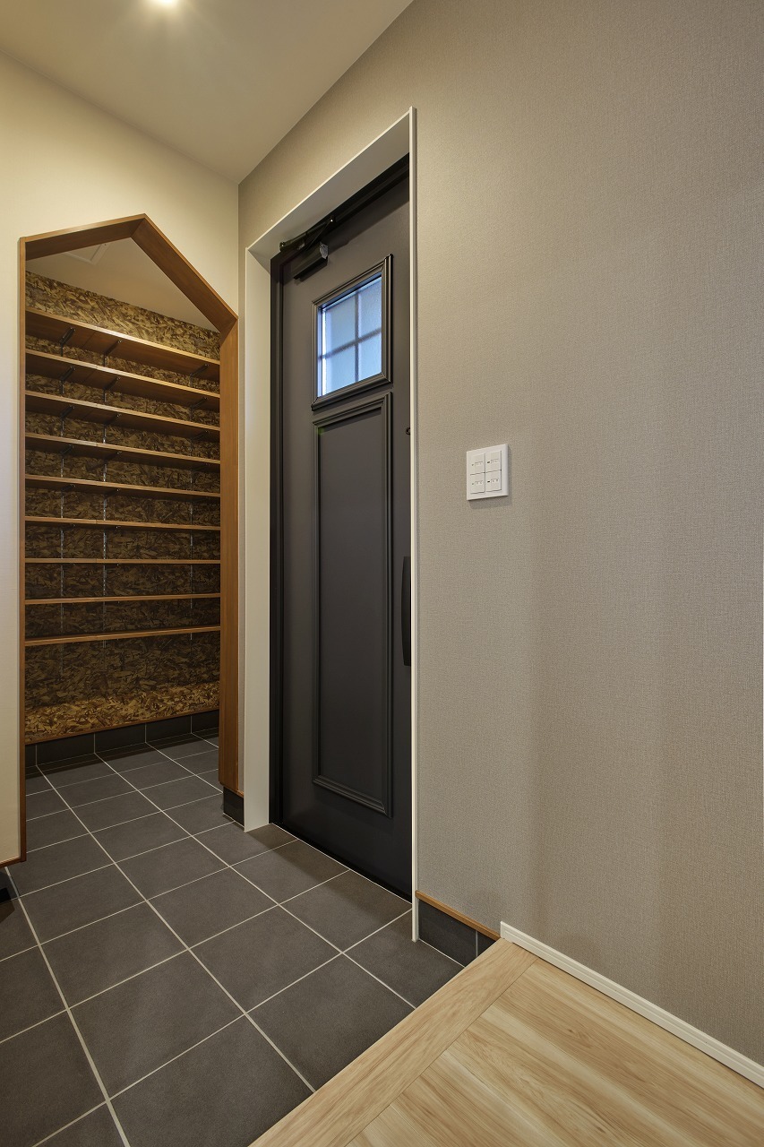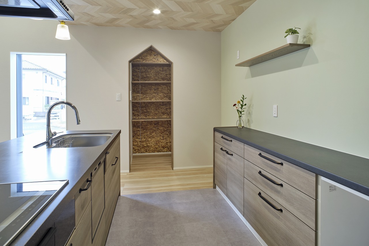 三角壁のパントリーは可愛く、リビングから続く広々テラスは